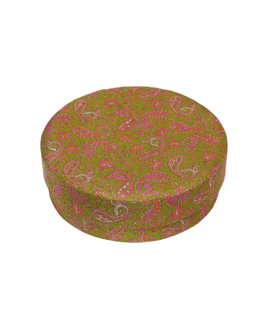 En smuk og unik opbevaringsæske beklædt med vintage silkesari – perfekt til smykker eller små, personlige skatte. Æsken er håndlavet i træ med blød bomuldspolstring og dækket både indvendigt og udvendigt med to matchende silkesarier.